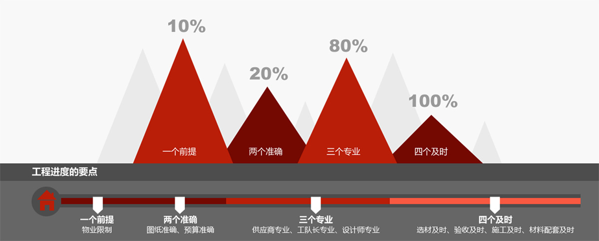 “四个及时”中,最容易被忽略的两点是选材与验收。我们认为要把工地井井有条的按计划执行客户应该在“选材及时”中给我们以配合。这个要求,可能觉得大多数的装修公司是不会跟客户说的,可能出于为了签单方便的原因,也可能出于内部管理松散。举例来说明,泥工进场时,若地面